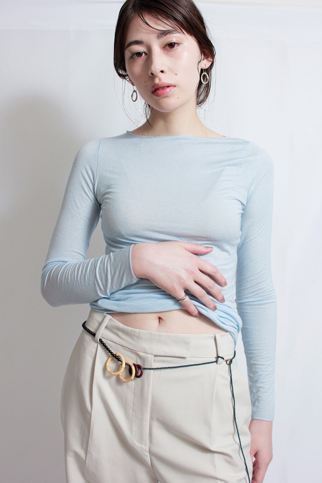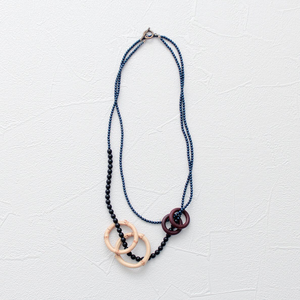 1130mmのロングネックレスにサイズの違うフープを通すことで、何通りもアレンジのきく仕様にいたしました。
